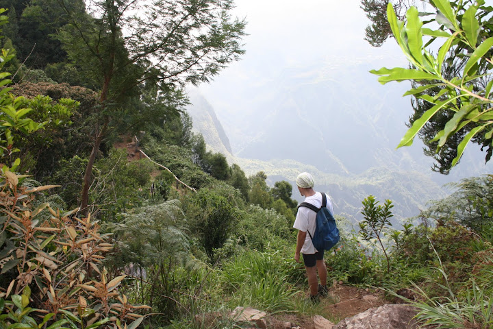 Et la, c'est une toute autre affaire. Un sentier juste assez large pour se croiser en touchant les épaules sur de la caillasse qui roule et dégringole de quelques kilomêtre dans le cirque de Cilaos juste devant.